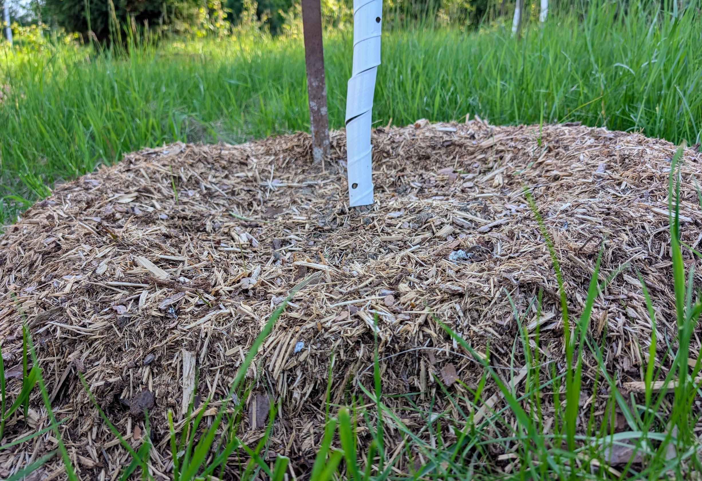 “You can utilize mulch to assist with creating a barrier surrounding the tree, but be careful not to ‘volcano’ the mulch around the base of the tree. Best practice is to create a donut 18” to 20” out from the tree.”