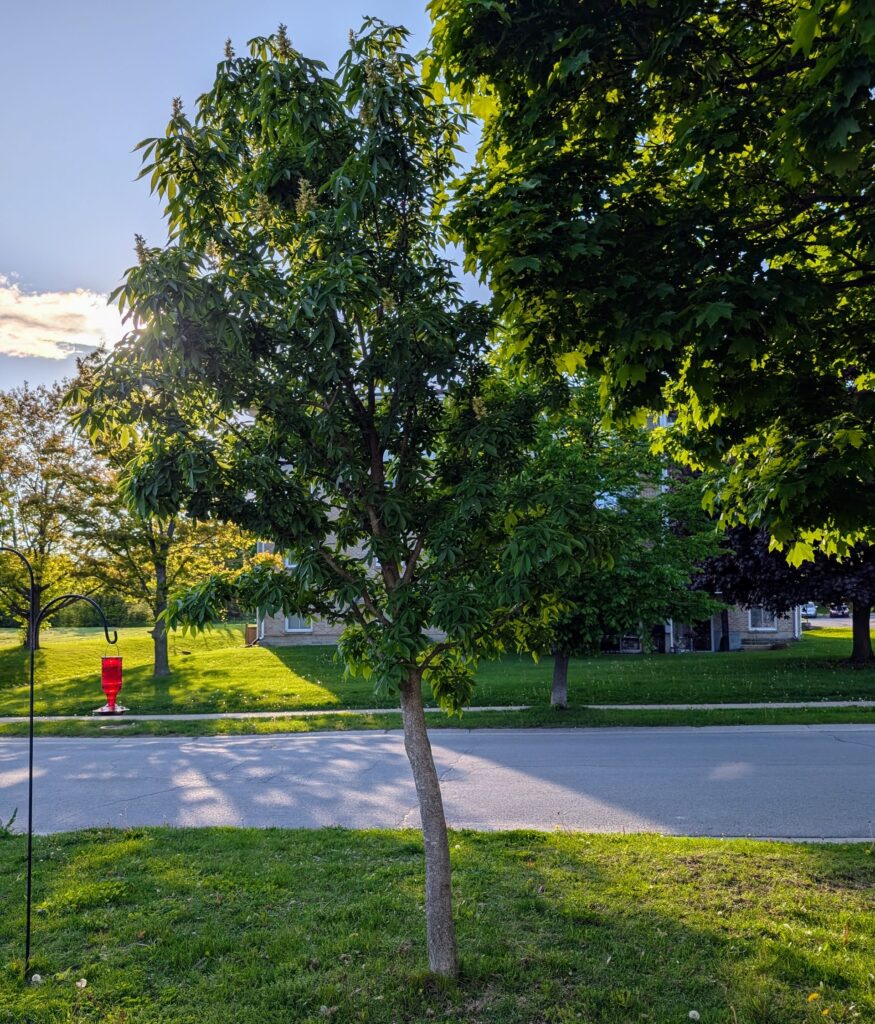 That tree is now thriving (though it’s growing a bit crookedly to avoid being under the canopy of the neighbour’s much-older maple tree), and I rarely water it anymore, but for a few years I had to monitor the tree the same way I watched and watered my gardens – frequently!